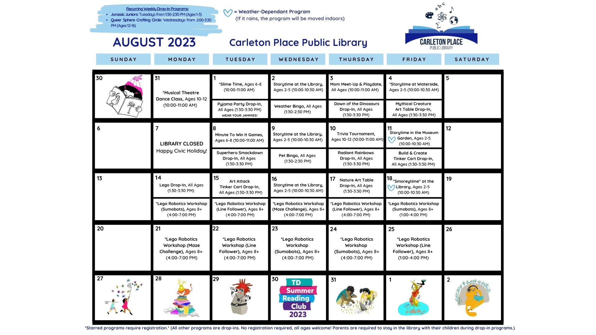 Please make note of the programs that are age specific and require registration. Registration for these will take place THE WEEK BEFORE the program only. Please see our social media or website to register, or ask at the front desk to be added. All programs are designed with the median age in mind so we will be strict with age requirements to allow everyone to have fun.