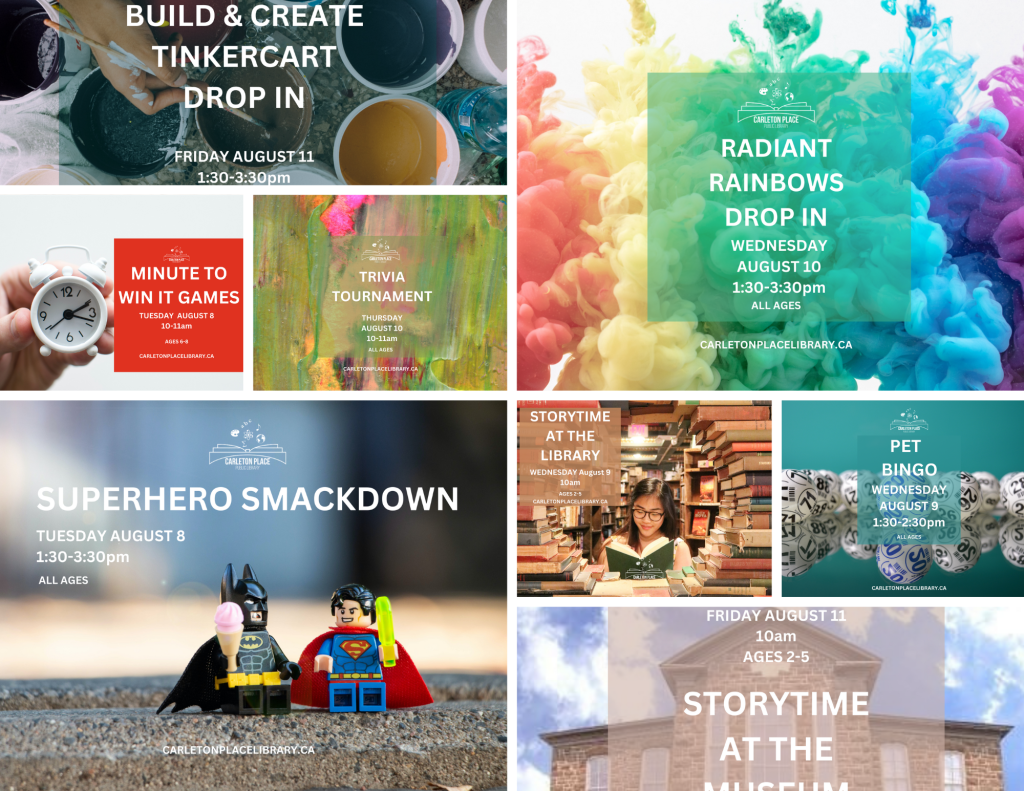“Storytime at the Museum Garden” – 10am, Ages 2-5 — We’re meeting one last time in the gardens at the Carleton Place & Beckwith Heritage Museum at 267 Edmund Street in Carleton Place–weather permitting! Bring something to sit on a make sure to wear sunscreen–it’s nice and shady but we want everyone to be safe outside this summer. See you there!