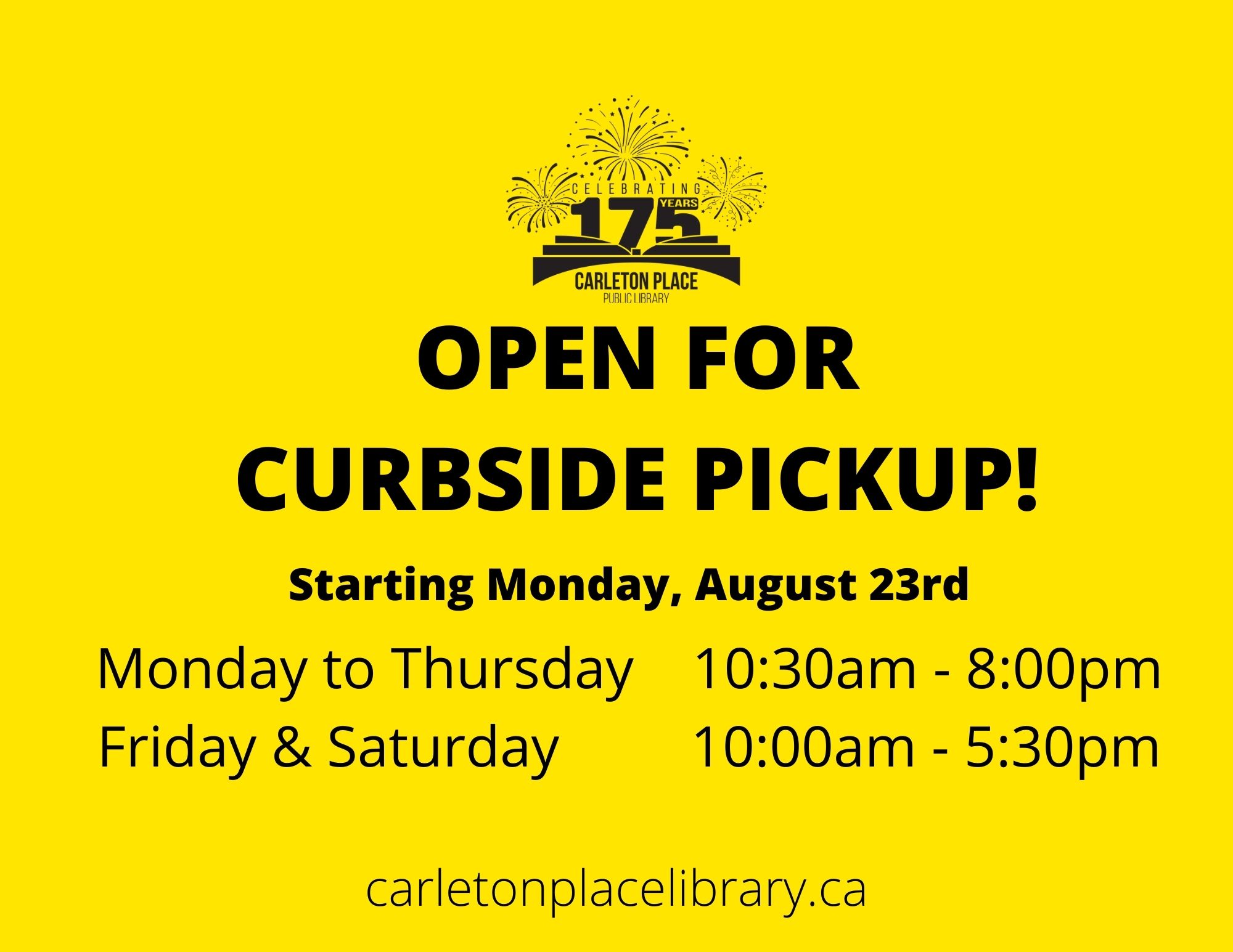 We are offering curbside pickup as the renovations to the library continue. Place your holds online or give us a call to get something started for pickup. We will be open Monday to Thursday from 10:30 am – 8:00 pm, and Friday & Saturday 10:00 am – 5:30 pm.